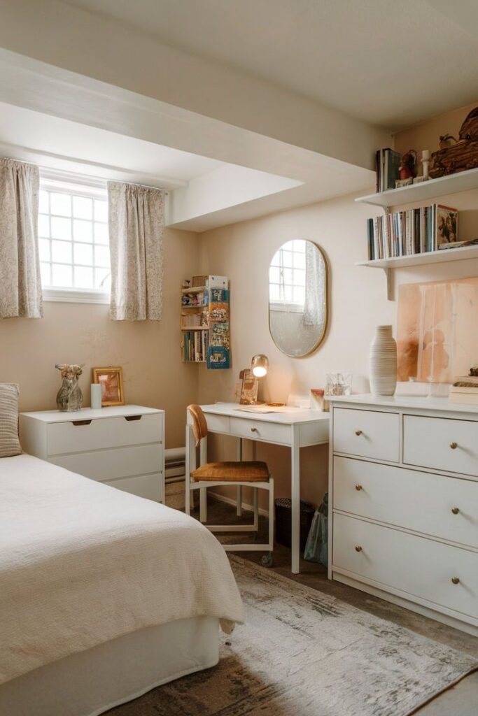 I swear, adding wood furniture makes a basement bedroom feel grounded and cozy instead of sterile. It’s like nature showing up to help you out.