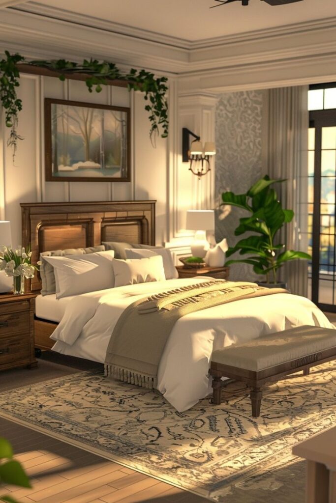 - Place the bed in a central or visually strong spot, often opposite the door.