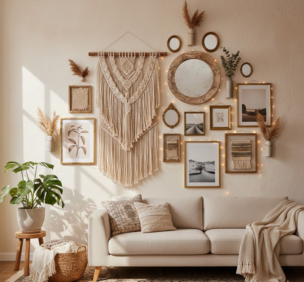 Blank walls kill the boho vibe fast. Boho wall decor should feel layered, global, and a little eclectic.