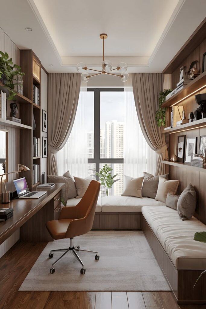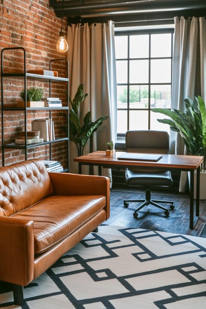 A velvet sofa in an office interior instantly adds sophistication. Deep emerald, navy, or even burgundy can elevate a plain room into something memorable.
