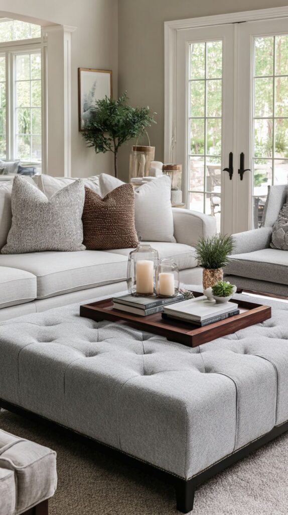 Sometimes you want comfort more than a hard tabletop. An upholstered ottoman works as a “coffee table” while keeping the whole space lounge-forward. And yes, you can still use it like a table—you just add a tray and call it a day.