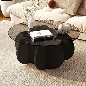Black Coffee Table, 31.5″ Round Glass Coffee Table for Living Room Mid Century Modern Coffee Table Unique Circle Center Table with Wood Base