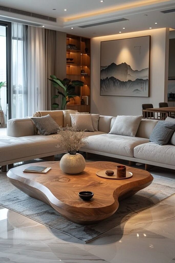 This layout looks especially good with an L-shaped sofa because it echoes the sectional’s split shape. You also get a built-in styling moment without trying too hard—because you already have “a set.”