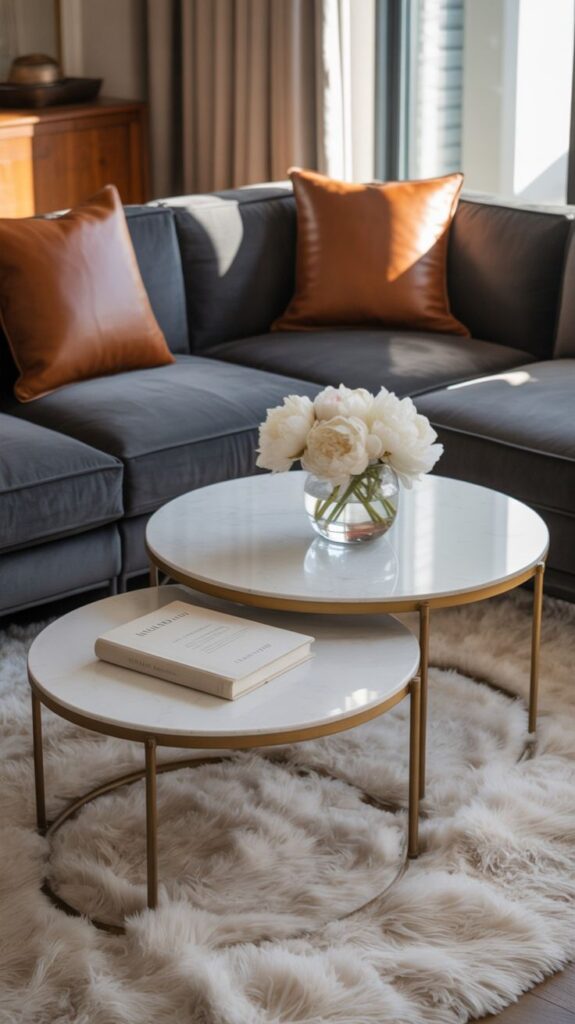 Two small tables (often round) give you flexibility that one big table can’t. You can shift them closer for movie night, separate them for guests, or open up space when you vacuum and pretend you enjoy it.