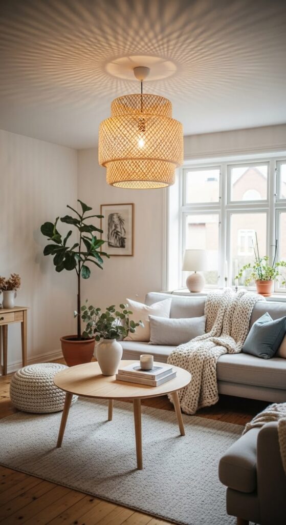 If you only change one thing for cozy Scandinavian apartment decor, change your lighting. I love a bright space, but overhead lighting at night can feel like an interrogation. You want warm, layered light that makes your apartment feel like a hug.