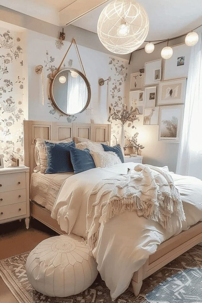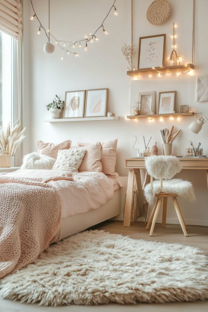 - Sleep zone → cute bedding + headboard/accent wall