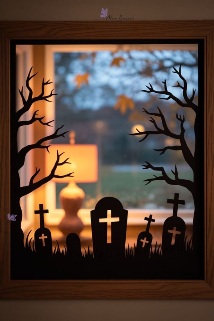 Nothing says “haunted house” like creepy shadows in your window. Cut out bat, witch, or ghost silhouettes from black construction paper (or black trash bags, FYI—they work great). Tape them inside your windows, then backlight them with orange LED lights.