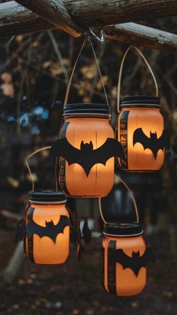 Empty mason jars lying around? Perfect. Paint them with orange, black, or blood-red acrylic paint. Then use a black Sharpie or cutout stencils to draw bats, jack-o’-lantern faces, or cobwebs.