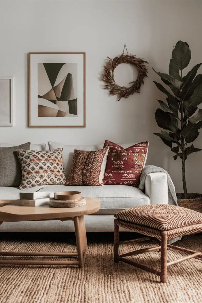 - Modern layer: abstract art, sleek candlesticks, simple mirror