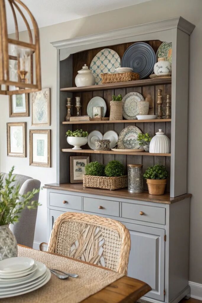 A farmhouse dining room hutch brings storage and personality in one shot. I love a vintage piece because it adds instant history, even if you found it online at 11:47 p.m. and panic-bought it. (No judgment. I respect the hustle.)