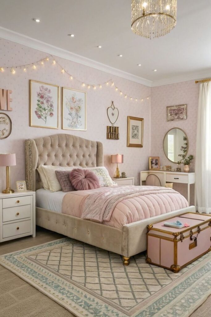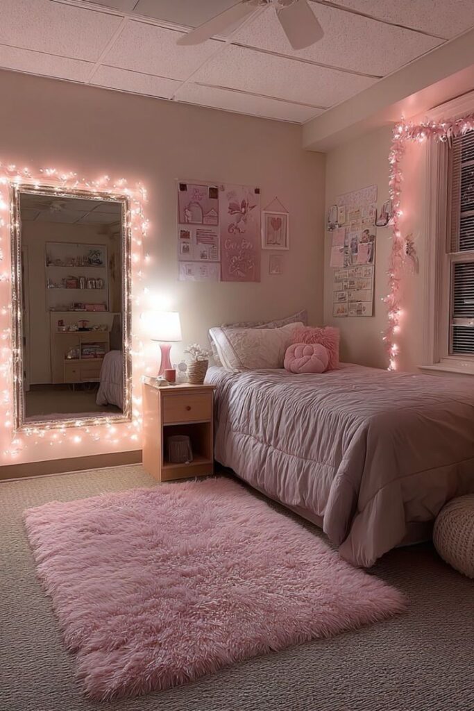 Mirrors help, too. A gold-framed mirror reflects light and echoes warm tones from the pink. You keep the room airy instead of cramped.
