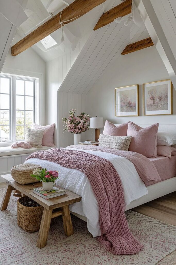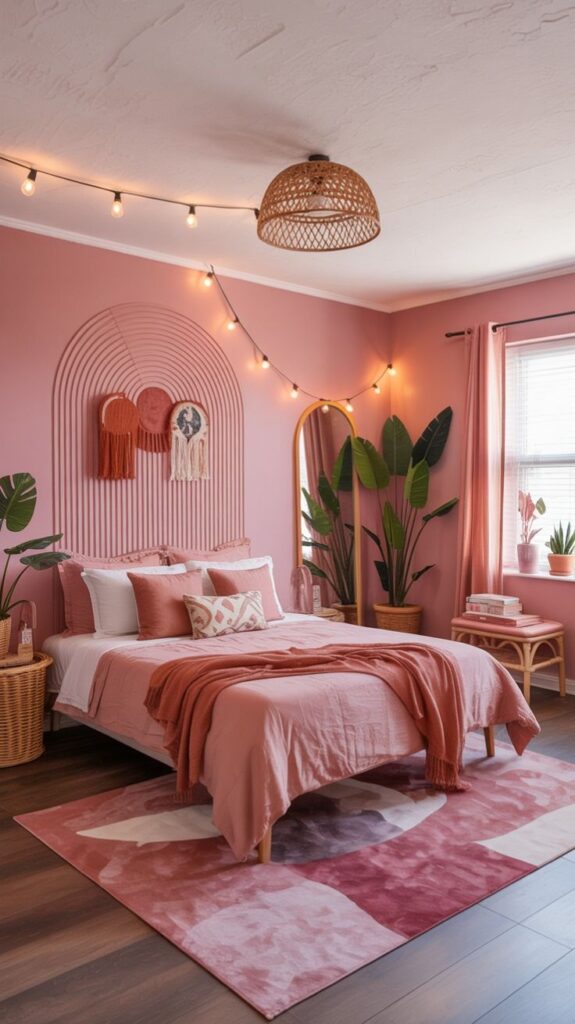 Try a velvet blush headboardwhite linen bedding, and a chunky knit pink throw at the foot of the bed. You mix sheen, softness, and structure, so the room feels layered rather than flat.