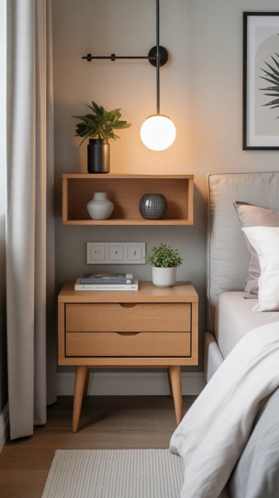 Classic nightstands look cute, but they eat space fast. Floating nightstands or slim stools keep things functional without turning your bedside into a traffic jam.