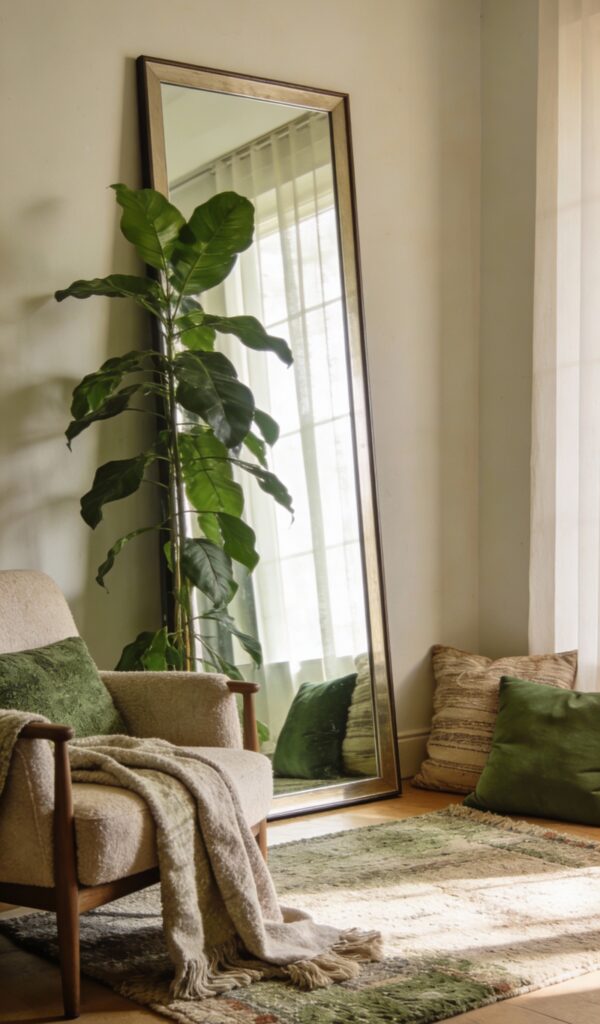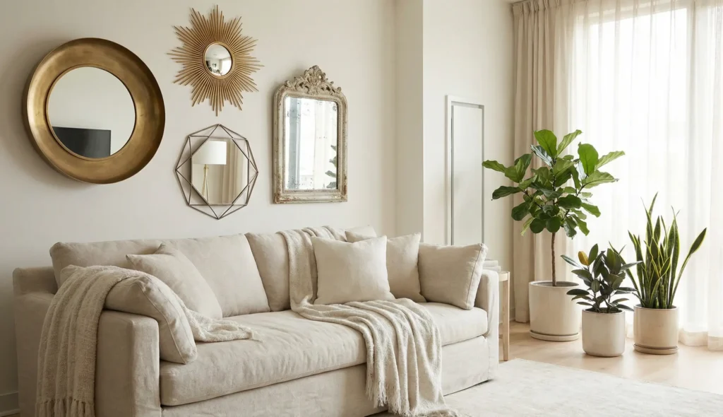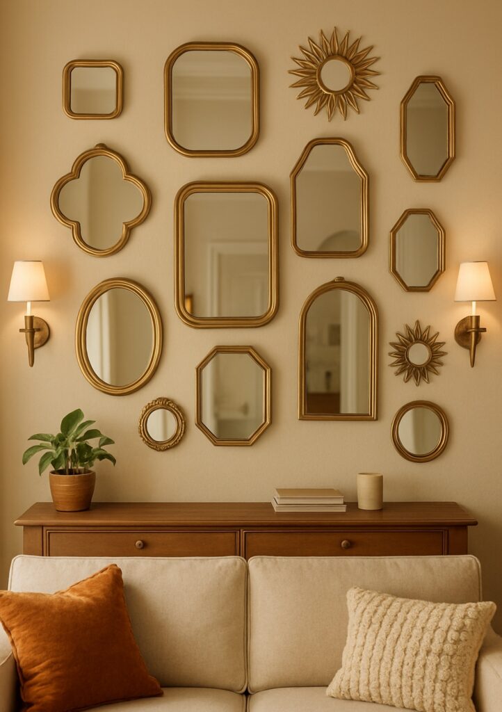 In one narrow living room, I used three tall mirrors behind the sofa, and the space suddenly felt twice as wide.