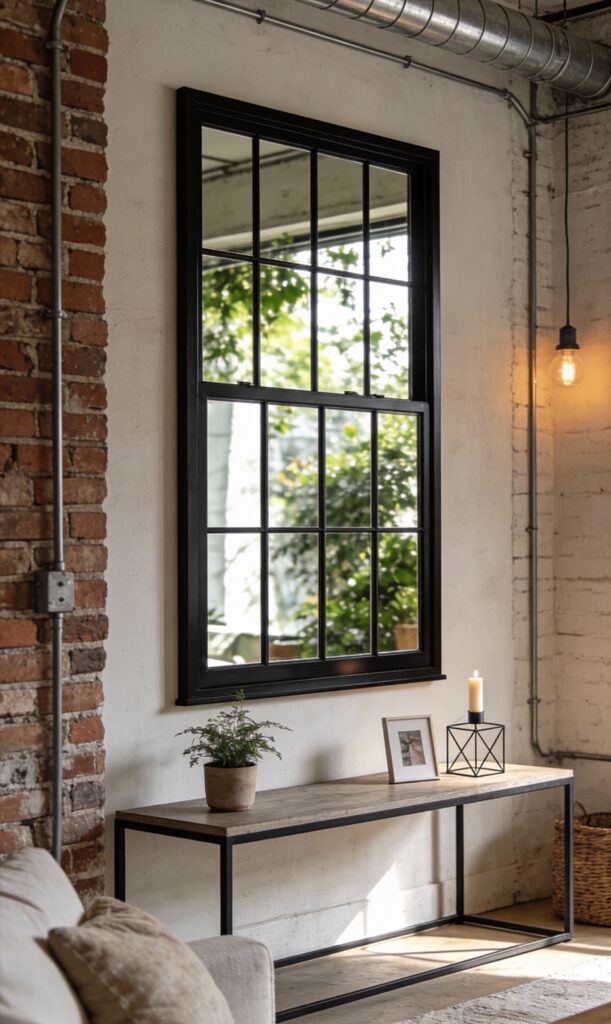 A windowpane mirror fakes a bigger, brighter living room without renovation drama.