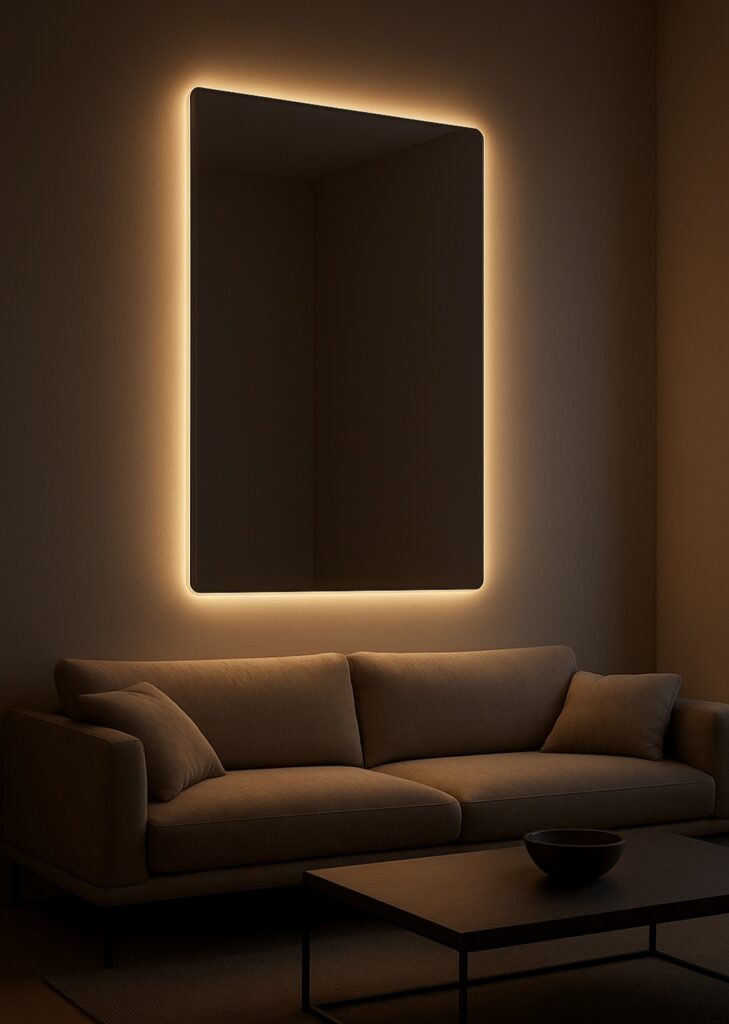 If you want your living room to feel slightly like a fancy hotel lobby (in a good way), try a backlit wall mirror.