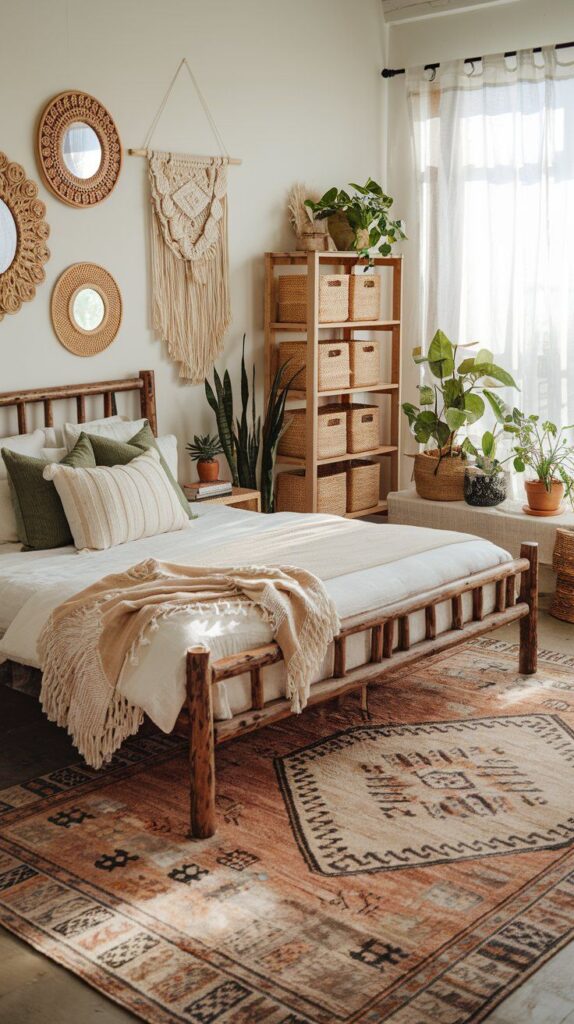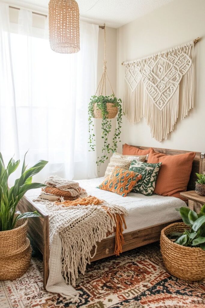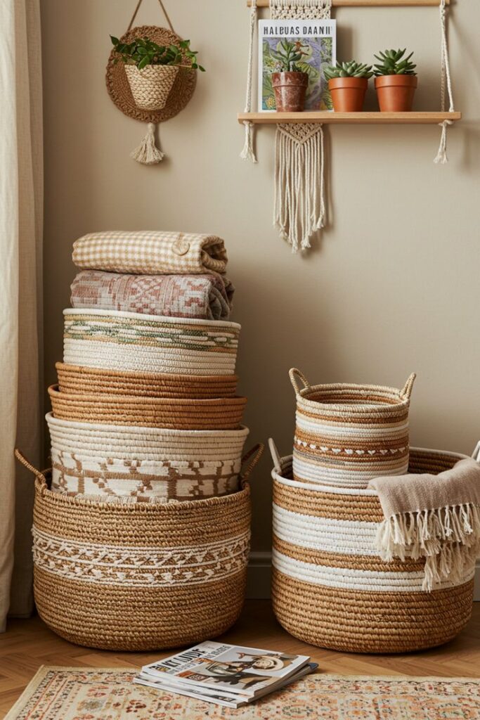 Baskets solve two problems at once: they add boho texture, and they swallow clutter. You can toss in blankets, hair tools, books, or laundry and keep the room visually calm. Choose baskets in similar tones so they look intentional, not random. Do you want your storage to look like decor without trying too hard?