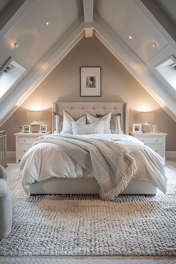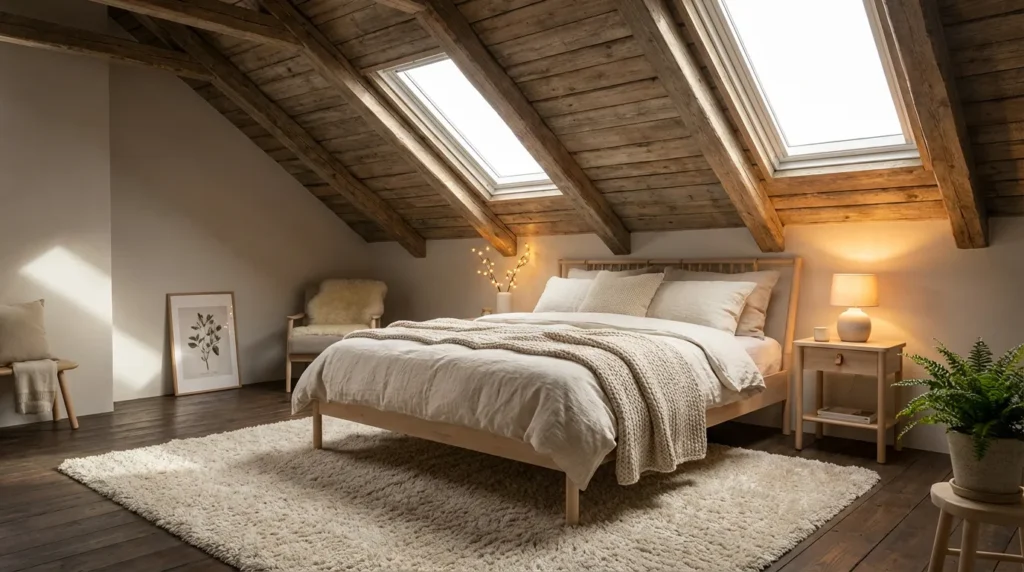 Attics are full of hard lines and sharp geometry. To counter this, you need texture. Think soft, fluffy, and rounded.