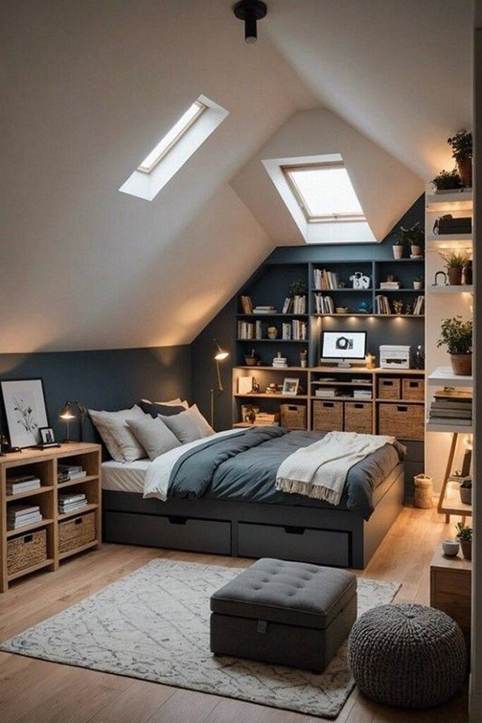 Plus, a low bed creates a distinctly “boho” or “zen” vibe that suits the attic aesthetic perfectly. Pair it with some floor cushions, and you have a chill zone that feels intentional, not forced.