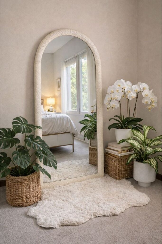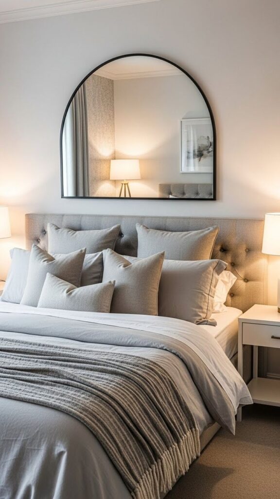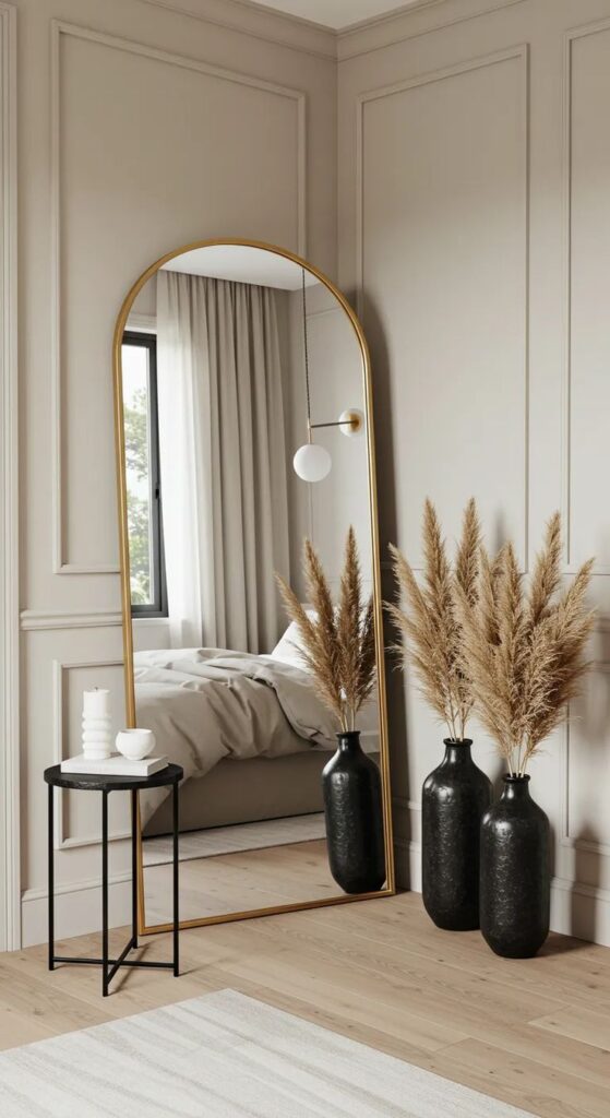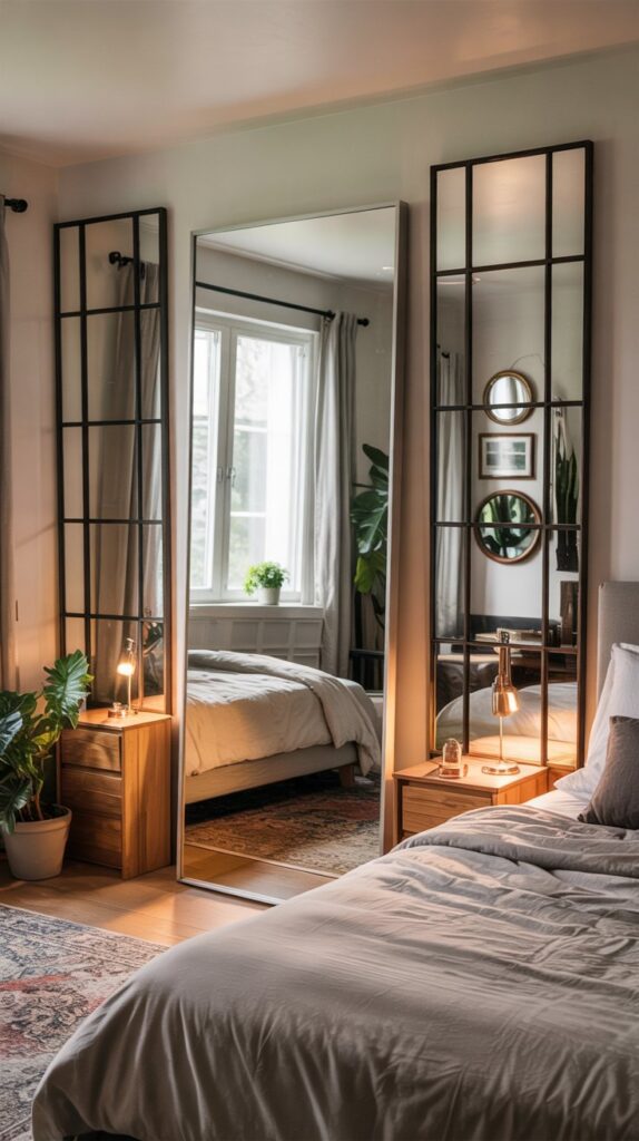 This trick works insanely well in small or dark bedrooms. You know that feeling when you walk in and the room suddenly feels like it breathes? That happens when you give the eye “fake depth” with tall mirrors.