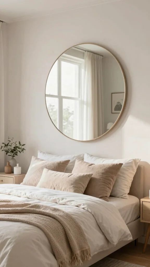 Ever walk into a bedroom and feel like it belongs in a boutique hotel? A big round mirror above the bed does that faster than any random canvas you grabbed on sale.