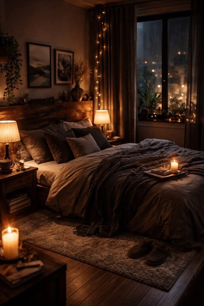 Lighting decides whether your room feels cozy or gloomy. I skip the harsh overhead vibe and add warm bulbs everywhere I can. Do you really want your bedroom to feel like an interrogation room?