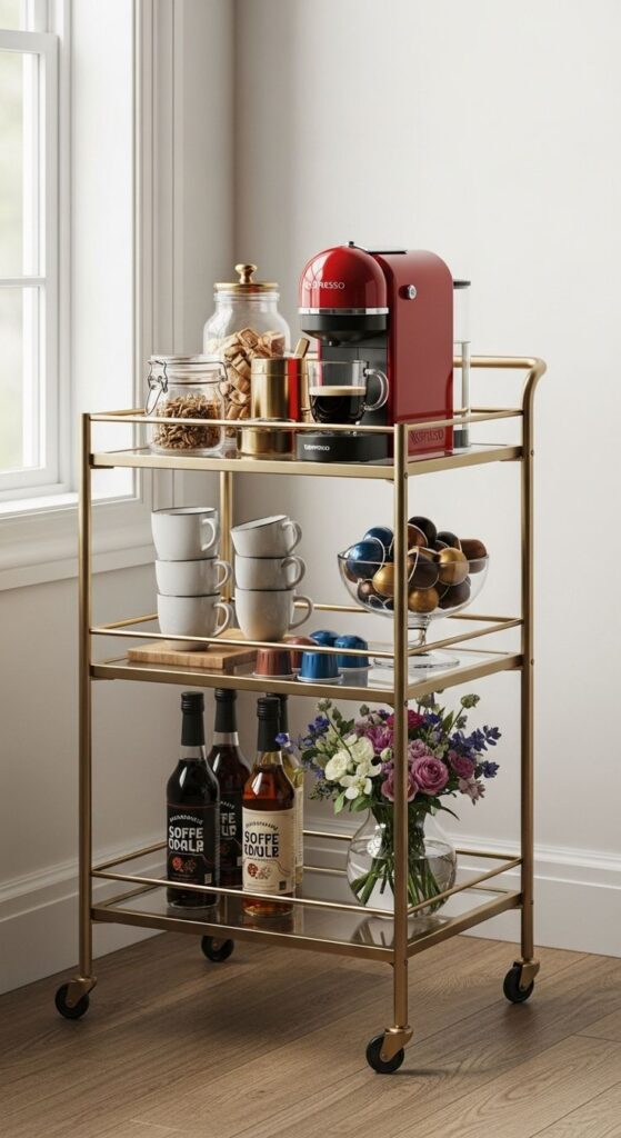 A bar cart already knows how to hold bottles and glassware, so it basically begs to hold coffee stuff. I’ve done this in a studio apartment, and the cart gave me a dedicated coffee bar without stealing my kitchen workflow.