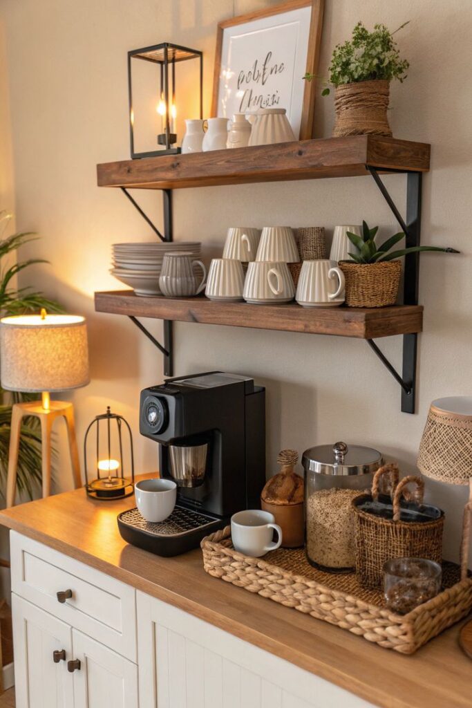 When you run out of counter space, you use the wall. I mount one floating shelf above a small surface (even a narrow console) and add hooks underneath for mugs. You get a full coffee bar vibe in about the footprint of a cutting board.