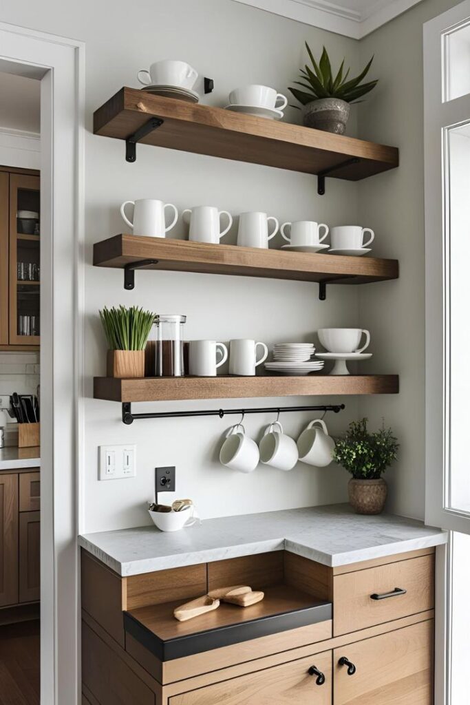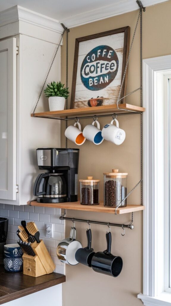 3) Mount a floating shelf + mug rail for a wall coffee bar