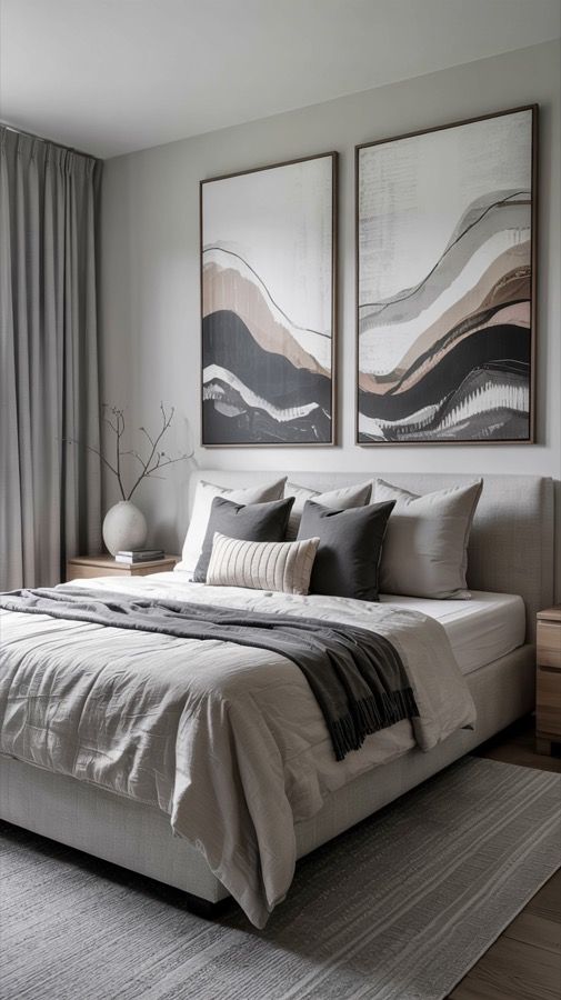 If you want personality without adding bold color, a grey-toned gallery wall nails it. I like black-and-white photography, charcoal sketches, and soft abstract prints in misty greys.