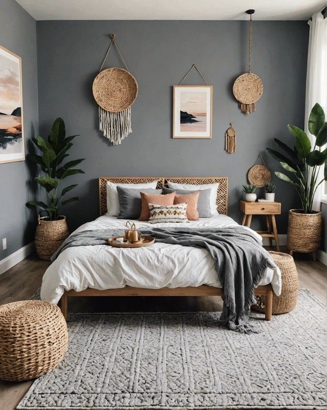 - Use grey for grounding (walls, rug, upholstered headboard).