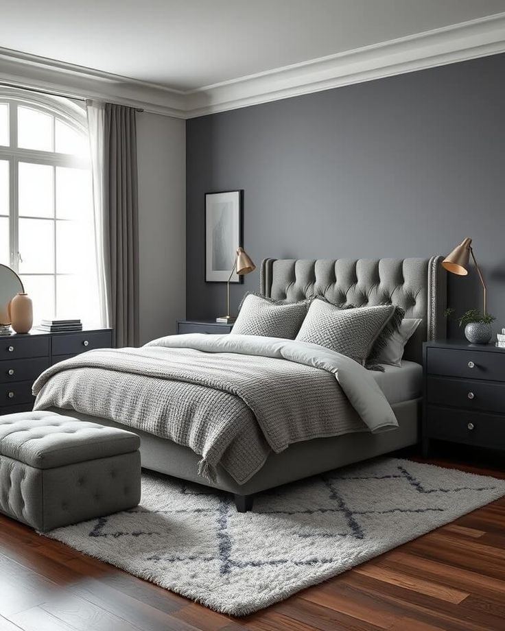 If light grey feels too safe and white feels too bright, charcoal gives you that moody calm. I love a charcoal grey accent wall behind the bed because it frames the space and makes the bed feel anchored.
