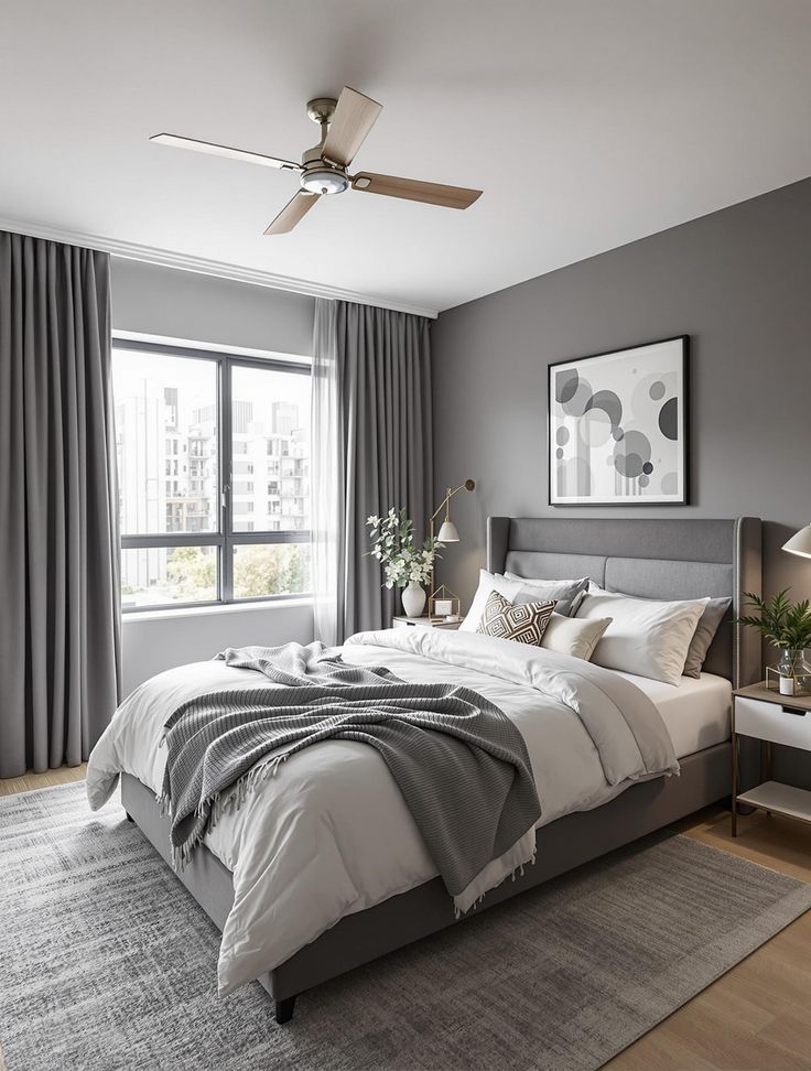 A calm neutral retreat still needs life. Plants give grey bedrooms a natural contrast that feels fresh instead of sterile. Even one plant changes the whole energy—seriously.