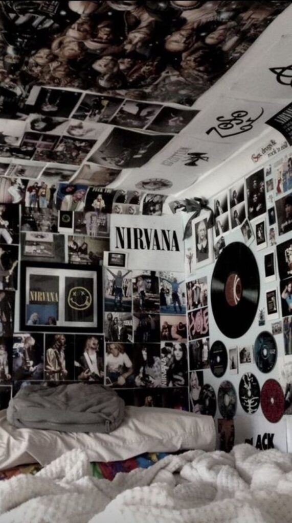 A grunge wall collage screams personality, and you can build one with posters, flyers, album art prints, and even pages from old magazines. I like a slightly chaotic layout, but I still keep a loose shape so it looks intentional. You can aim for a rectangle, a strip above the bed, or a corner takeover.