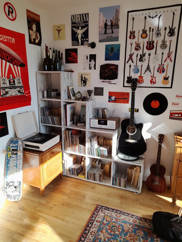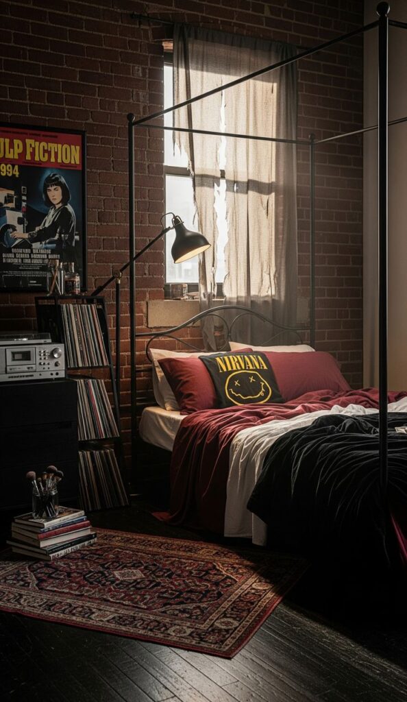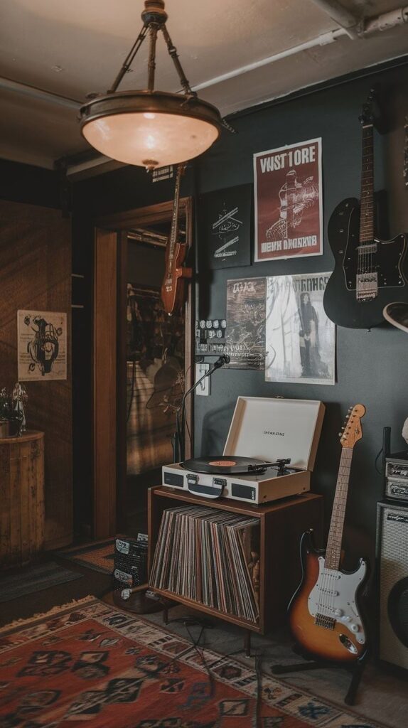 Grunge room inspo always looks better when it ties to music. You can set up a small corner with speakers, a record player, band books, or a guitar stand. I love a music corner because it makes the room feel personal instead of staged.