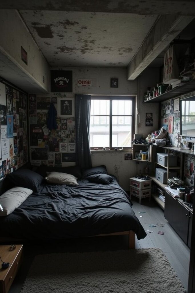 Your bed takes up visual space, so you should treat it like the anchor. Grunge bedroom ideas work best when you layer dark bedding, then add texture with throws and pillows. I like black or charcoal sheets, then I throw on a faded quilt or a plaid blanket.