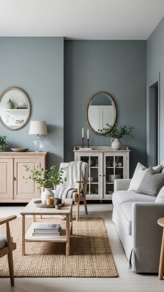 5) Soft White + Dusty Blue + Pewter (Airy, Polished, Grown-Up)