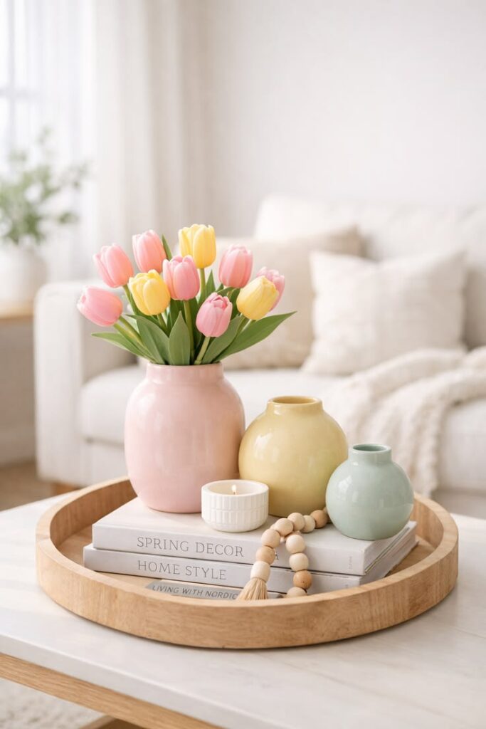 I use a simple tray, one book, and one decorative object. Pink shows up as an accent, not a takeover.