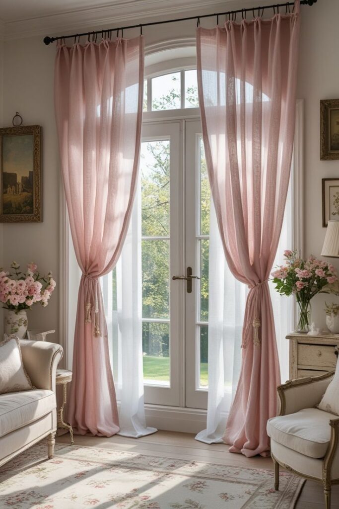 For color, you can go full blush curtain panels or choose off-white curtains with a pink undertone. Either way, you get that soft glow that screams “I own matching glassware” (even if you don’t).