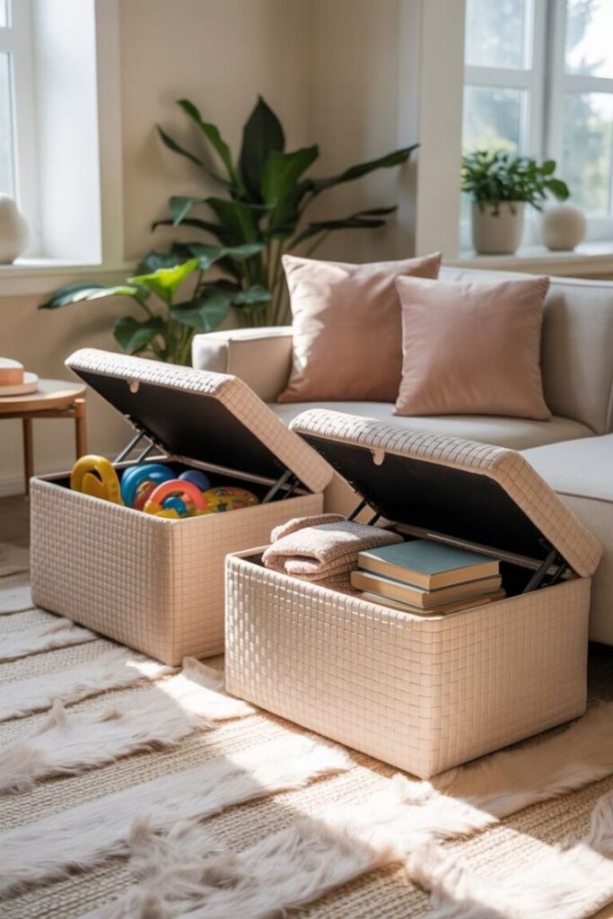 10) Make Storage Cute: Pink Baskets, Ottoman Storage, and “Hide It” Solutions