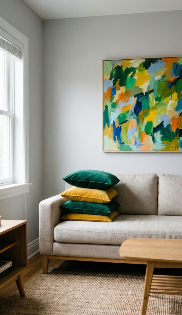 I’m not going to tell you that you must paint everything white. But a light, neutral base (soft greys, warm beiges, muted greens) on walls and large furnishings does create an airy, reflective canvas.