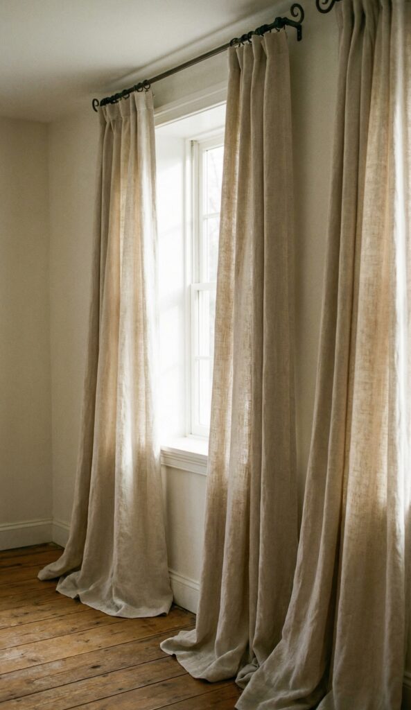 Choose light-filtering fabrics like linen or cotton in a color close to your wall. This frames the window beautifully and emphasizes the room’s height, pulling the eye upward. It’s a pro decorator trick that’s embarrassingly easy to copy.