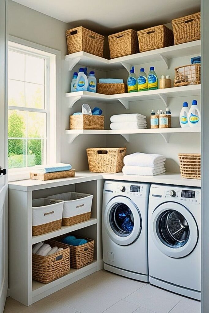 - Floating shelves above the washer/dryer for detergent and baskets