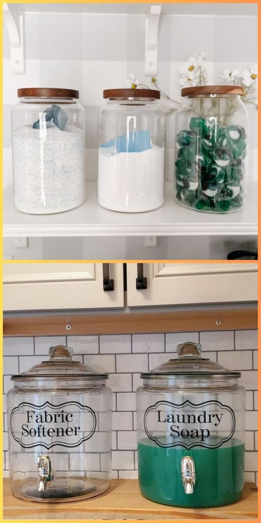 If shelves look cluttered no matter what you do, you might need to change how you store supplies. Wall-mounted or shelf-mounted detergent dispensers and pod containers give you controlled access and fewer toppled bottles.