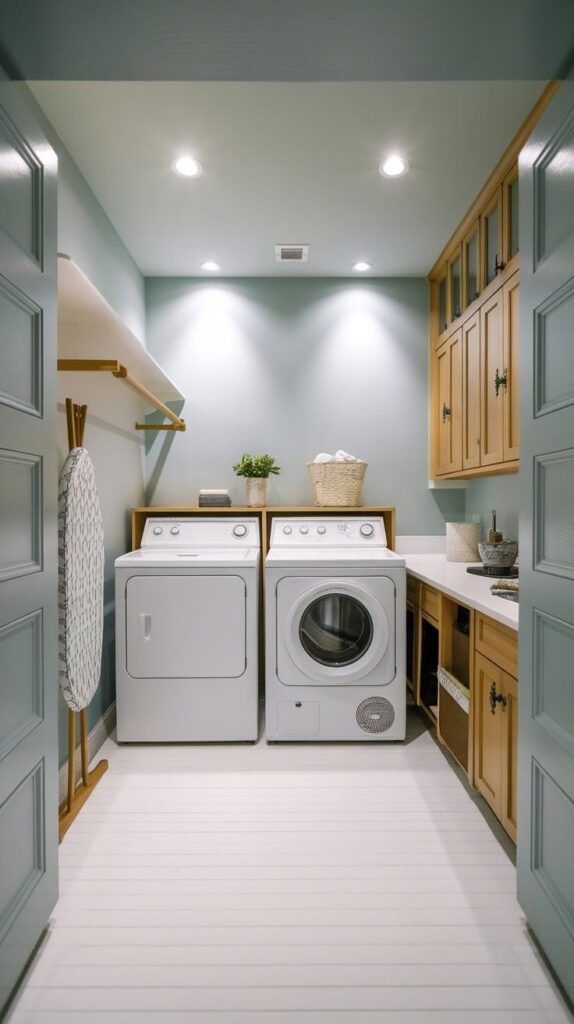 Small laundry rooms don’t have floor space to spare, so I always start with the walls. When you store upward, you keep your walking area open and your brain less chaotic. Why let blank drywall sit there looking pretty when it could hold your supplies?