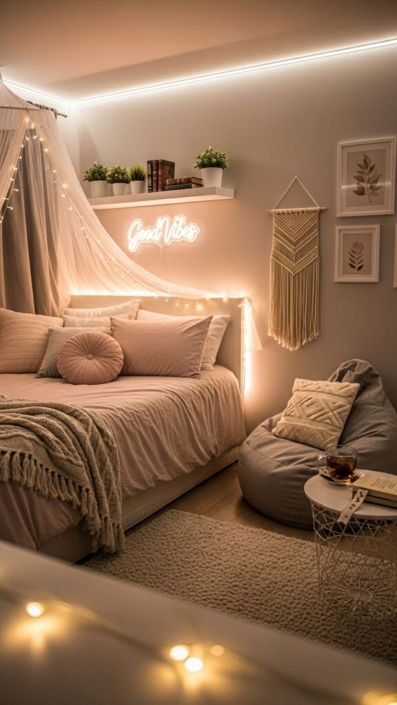 Focus on muted pastels (think dusty rose, buttercream, sage). Add warm lighting and fluffy textures so the room feels like a hug. Would you rather sit in a bright overhead light or in a cozy glow that makes everyone look well-rested?