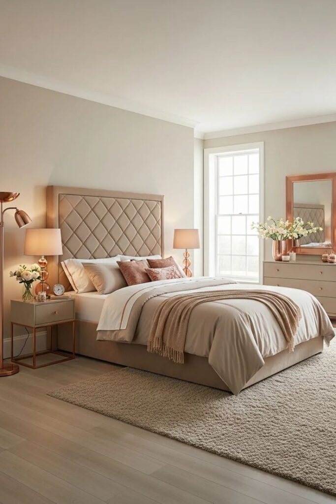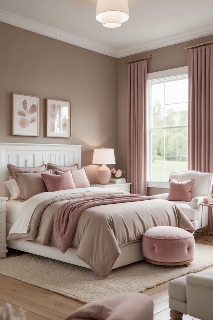 If you want a feminine bedroom without going full cotton-candy overload, start with blush, cream, taupe, and warm white. This combo always looks expensive, even when you shop sales like a professional.