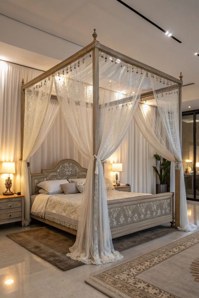 Straight lines look modern, but curves feel inviting. A few rounded shapes instantly soften the whole room and push it into “stunning feminine bedroom” territory.
