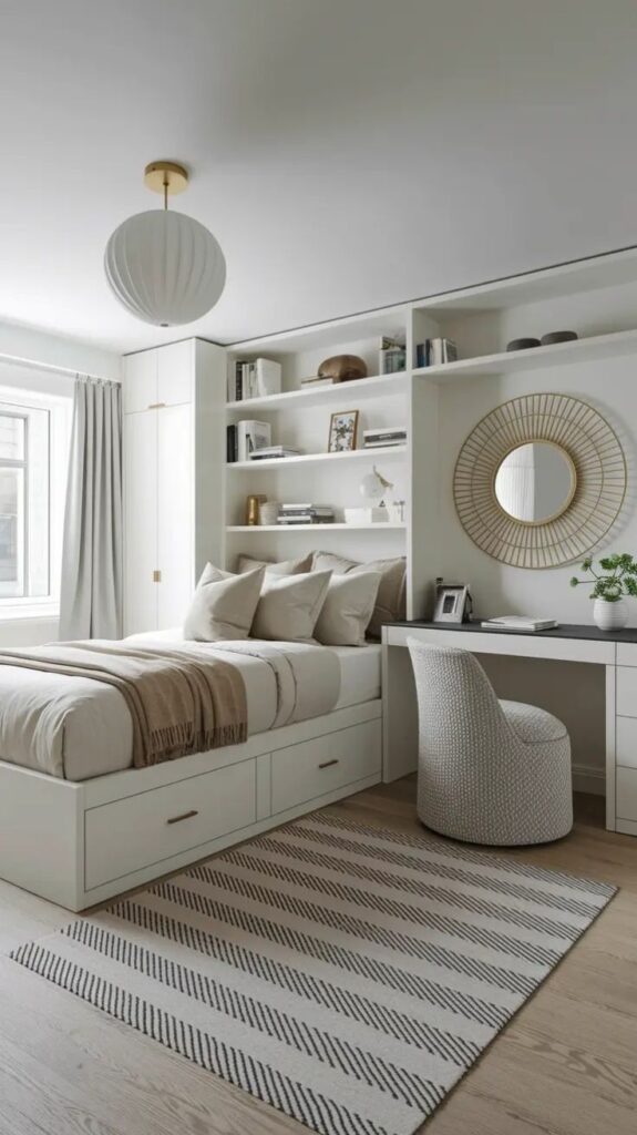 Even if you don’t read every night, a reading nook makes your room feel luxurious. You create a little “me zone,” and you stop doom-scrolling in bed… at least sometimes.