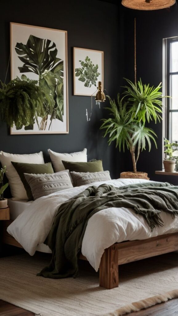 Plants make green and black bedroom decor feel alive instead of theatrical. Choose darker foliage so it blends with the vibe while still adding organic shape.